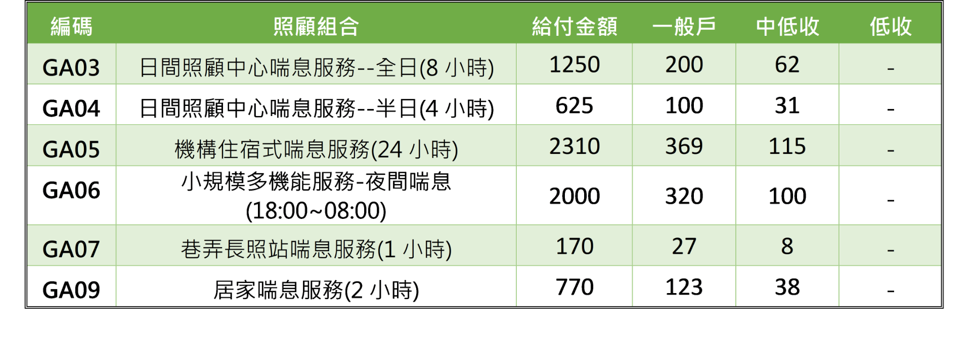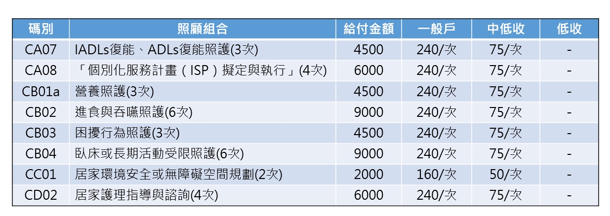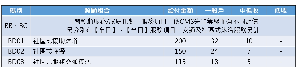 照顧服務:居家服務、日間照顧中心、家庭托顧等服務,提供身體與日常照顧服務。